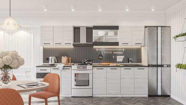 Це сучасна та оригінальна кухня в стриманому стилі модерн. Він характеризується чіткими лініями, дерев'яними елементами та головне — мінімалізмом в інтер'єрі. Саме він забезпечує її компактність та функціональність. При зовсім не великих розмірах кухня досить вмістка. Вона виготовлена з високоякісних матеріалів: корпус та фасад кухні виготовлений з ДСП з підвищеною стійкістю до вологи та температур, фурнітура якісна, направляючі використовуються роликові.