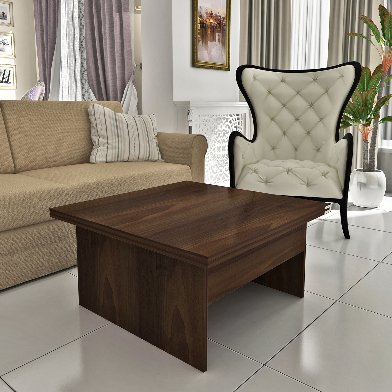 Чи можна за невеликим журнальним столом розсадити гостей, відзначити день народження, іменини і т. д. При цьому не заважати один одному, відчувати себе вільно і комфортно. Можна, якщо купити стіл-трансформер, який дуже легко розкладається з журнального столу, високий (75см), і збільшується по площі в 2 рази. Для трансформації столу використовується посилений механізм трансформації, що дозволяє легко розкласти стіл навіть дитині. В розкладеному положенні стіл міцний і стійкий. Для зручності пересування по кімнаті розроблений варіант столу на колесах з фіксаторами.