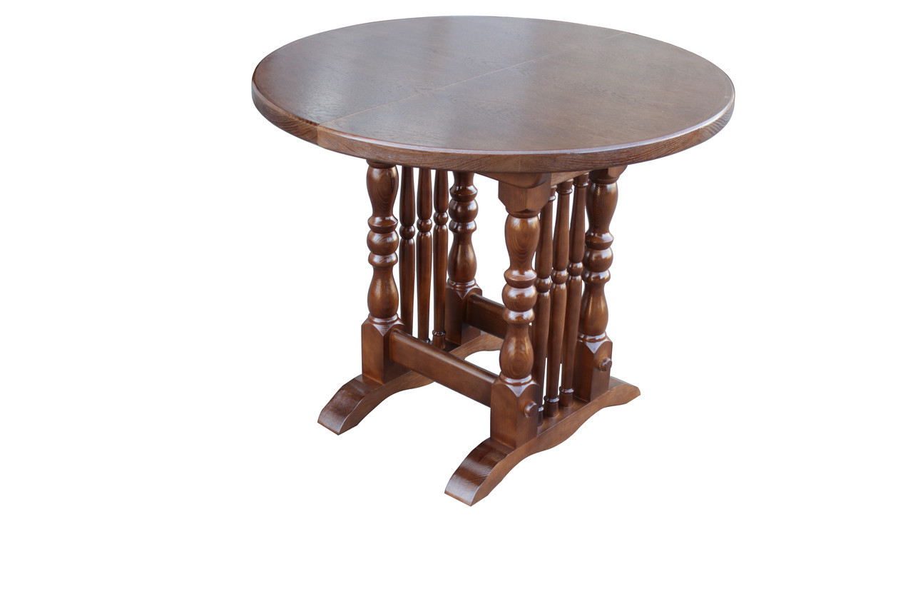 Красивий круглий обідній стіл Баварія-03 у класичному дизайні має фігурну ніжку та якісний дерев'яний каркас. Можливість розкласти обідній стіл оцінить люблячий приймати вдома гостей. У такому вигляді довжина виробу становить 125 см – достатньо, щоби знайшлося місце всім членам сім'ї. Матеріал виготовлення: комбінація масиву - сосна, деталі, фанеровані натуральним шпоном.