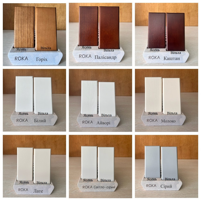 - Колір: каштан, махонь, горіх, темний горіх, білий, молоко, фокс